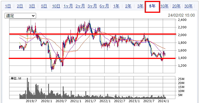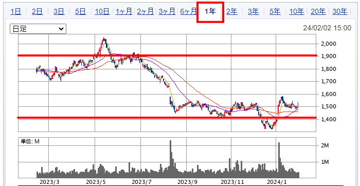 上記が一年チャートになります。現在は1500円を挟んだ下値のボックス相場になっています。