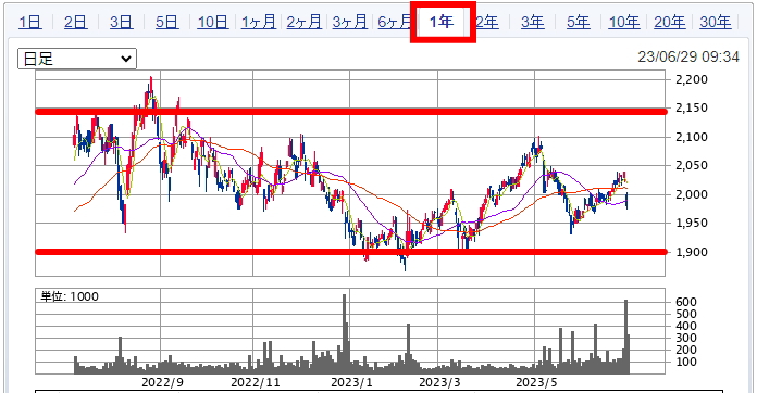 下限が1,900円、上限が2,150円なので、やはり2,000円前後が買い場で、1,900円台で買えていれば良いですね。