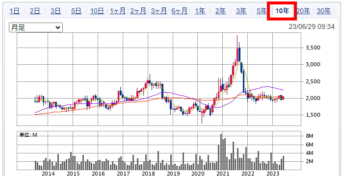 株主優待を狙う場合は、長期保有が原則となりますので、今回は10年チャートを見てみましょう。