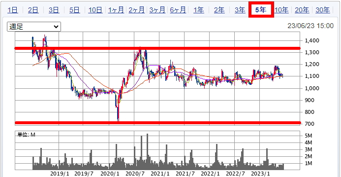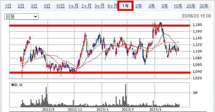 2023年6月23日(金)の終値は1,110円でした。この時点でのPBRは0.95倍ですので、買いに入りやすい価格にあると言えます。