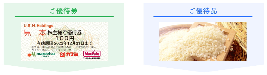 権利確定日は、2月末と8月末になりますので、この時に株式を保有していると、「マルエツ」「マックスバリュー関東」「カスミ」で使用できる優待割引券がもらえます。またお近くにこれらのスーパーがないという方は、食品などの優待品を代わりにもらうこともできます。