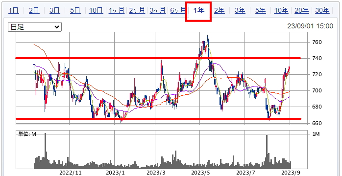 下値は660円近辺、上値は740円くらいであり、現在の株価は往復移動の上値近辺にあり、一見入りづらい位置に見えます。出来れば700円以下で仕込みたいところです。