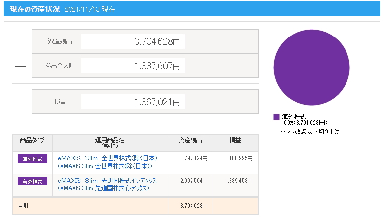 1,867,021円の積み立て金に対して、1,837,607円の利益ですから、ほぼ資産が倍増して合計が3,704,628円になってました。